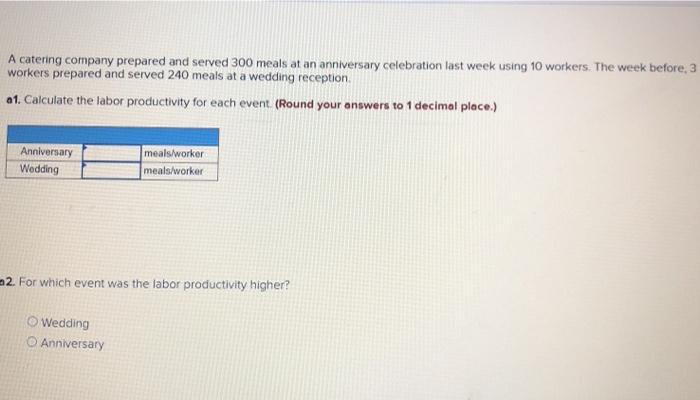 A catering company prepared and served 300 meals at an anniversary celebration last week using eight workers. The week before six workers prepared and served 240 meals at a. The week before six workers prepared and served 240 meals at a.