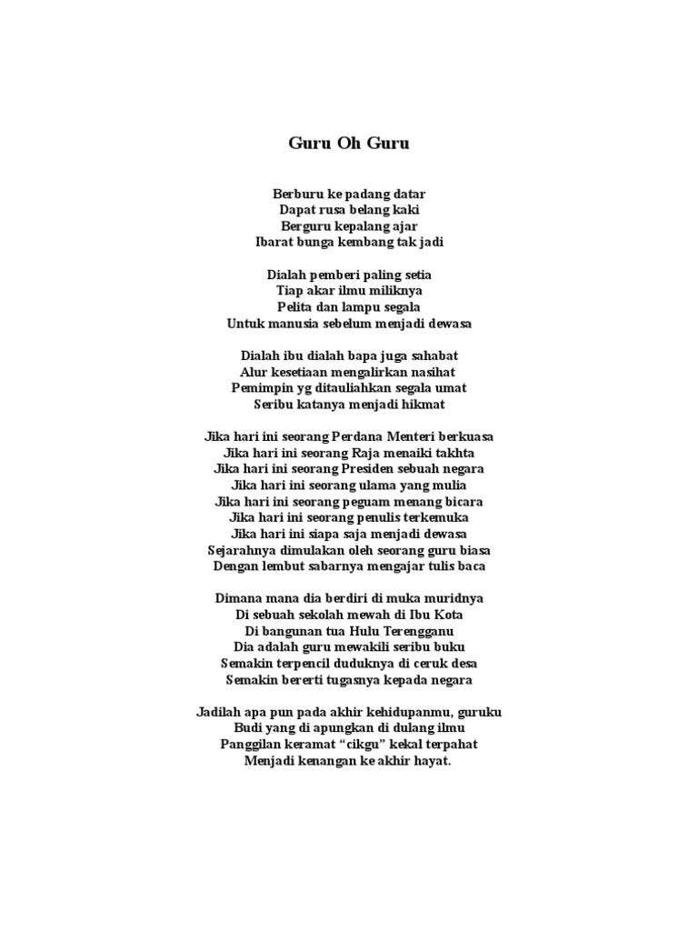 We would like to show you a description here but the site wont allow us. Guru oh guru Berburu ke padang datar Dapat rusa belang kaki Berguru kepala ajar Ibarat bunga kembang tak jadi Dialah pemberi paling setia Tiap akar ilmu miliknya Pelita dan lampu segala Manusia sebelum jadi dewasa. Rabu Ogos 21 2013 Unknown.